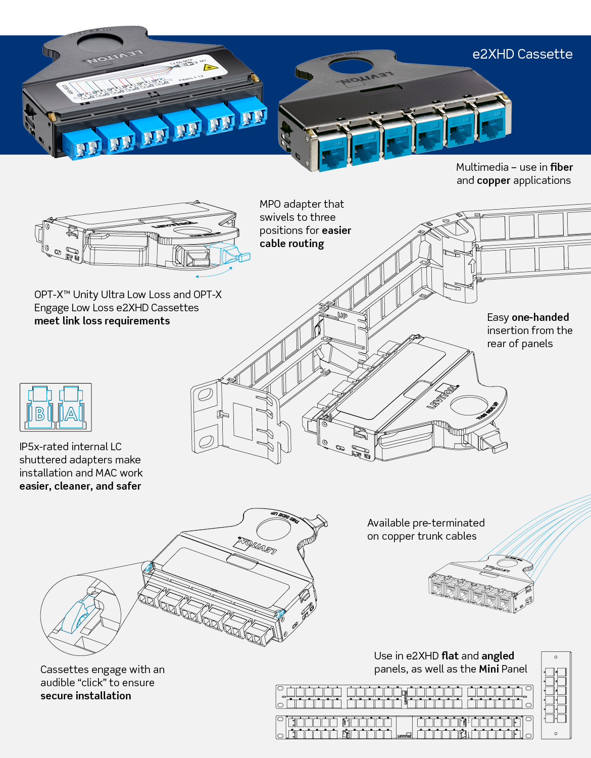 The e2XHD patching platform features cassettes that quickly snap in and pull out of the panels, making installation, moves, adds, and changes easier than ever. Copper cassettes use field terminated connectors, while fiber cassettes are pre-terminated for fast deployment and assured high performance. Universal panels support UTP, shielded copper and optical fiber.