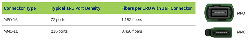 The MMC allows for a much higher density footprint with three times the port density over the MPO connector, making it ideal for very space constrained locations.