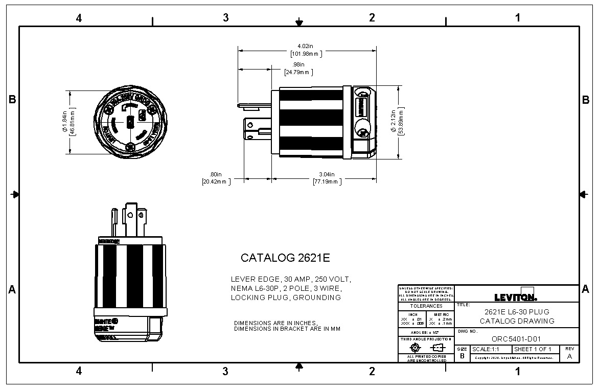 Black & White® Lever Edge™ 30 Amp 250 Volt Locking Plug, NEMA L6-30P, Grounding, Industrial Grade