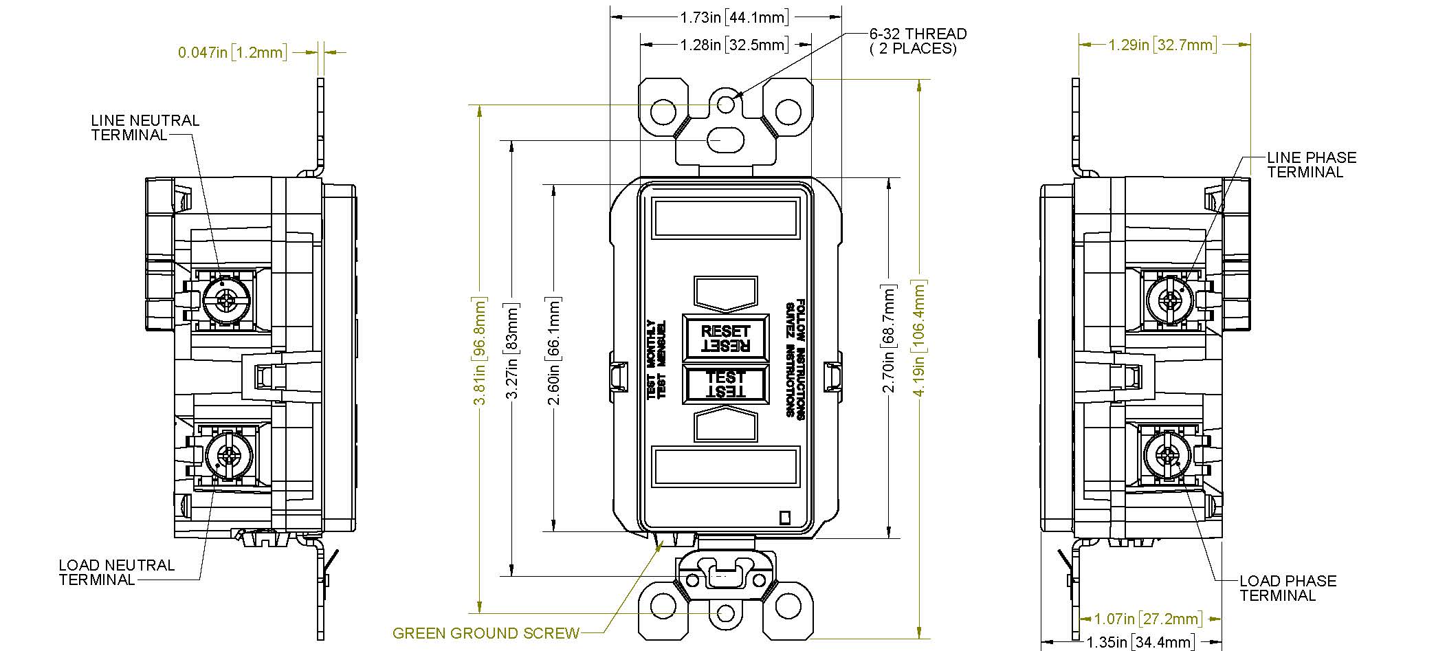 - Patented bridge contact design provides individual sets of contacts for receptacle face and downstream receptacles; no power will be delivered to receptacle face if improperly wired (line-load reversed)