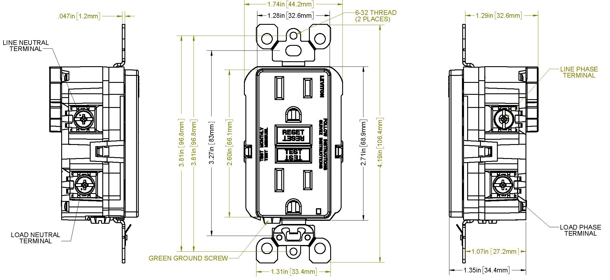 - Patented bridge contact design provides individual sets of contacts for receptacle face and downstream receptacles; no power will be delivered to receptacle face if improperly wired (line-load reversed)