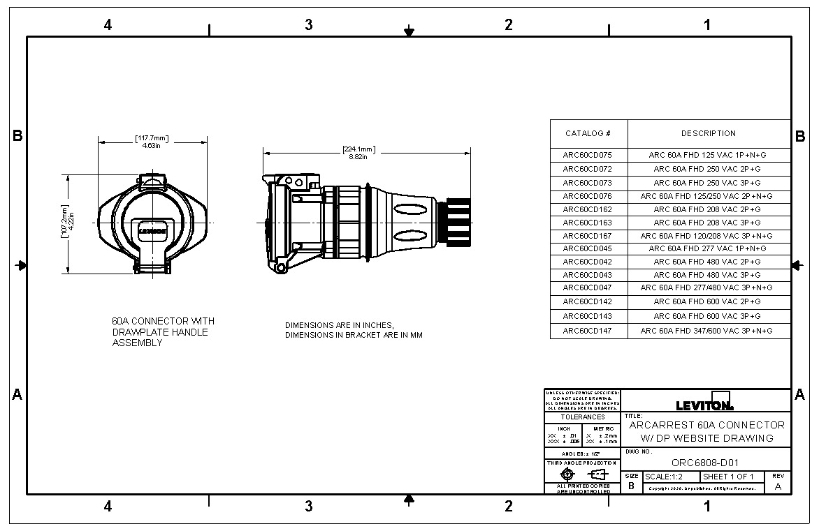 60 Amp, 250 Volt, 2P+G, ArcArrest Switch-Rated Pin & Sleeve Connector with Drawplate, NEMA Type 4X, IP69K Rated, UL2682 - Gray
