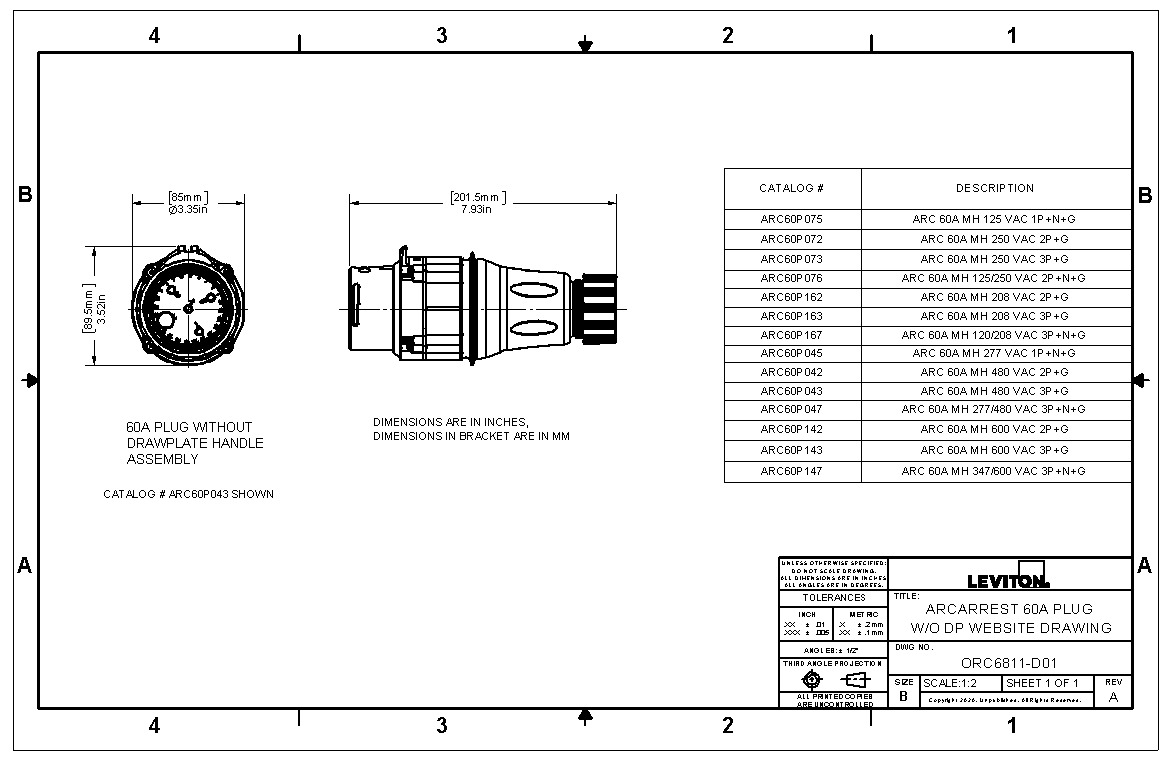 60 Amp, 3Ø 120/208 Volt, 3P+N+G, ArcArrest Switch-Rated Pin & Sleeve Plug without Drawplate, NEMA Type 4X, IP69K Rated, UL2682 - Gray
