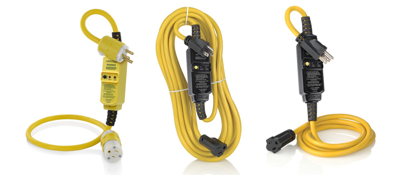 The portable Commercial GFCI manual reset (yellow model) is equipped with industrial grade plugs and connectors for long service life in heavy-duty applications. The automatic reset (black model) features polycarbonate, ultrasonically welded bodies for excellent resistance to harsh weather conditions.