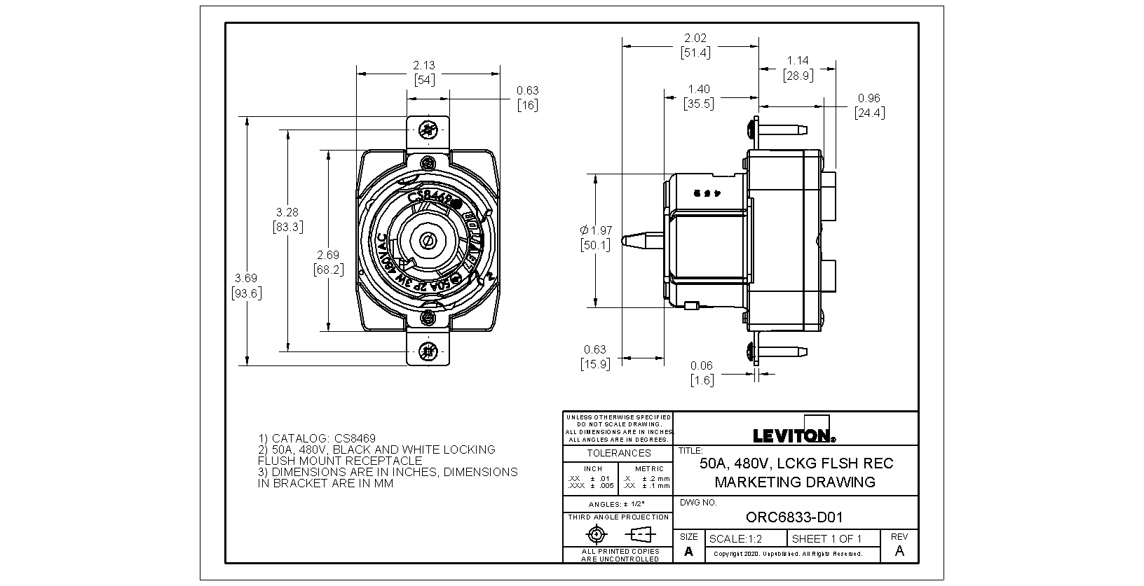 50 Amp, 480 Volt, Black & White Locking Flush Mount Receptacle, Industrial Grade