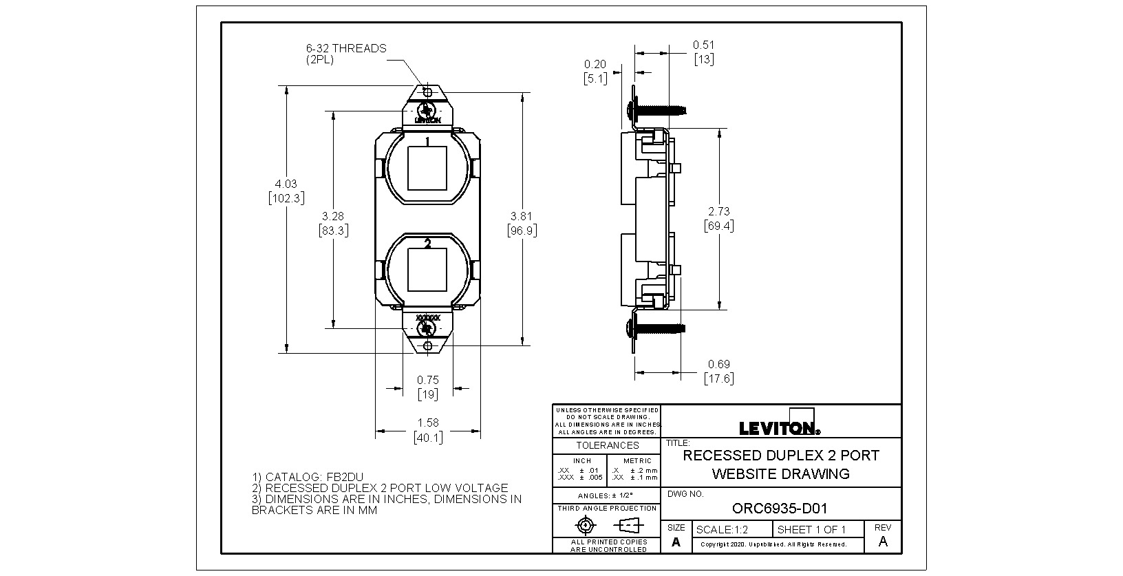 Recessed Duplex 2-Port Low Voltage Insert For Use with FBC1X