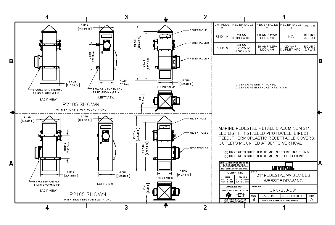 Marine Power Pedestal, Durable Metallic Aluminum, 21-Inch Height for Dockside Power. Pedestal includes (1) 50 Amp 125/250V, (1) 30 Amp 125V, and (1) 20 Amp GFCI Duplex Receptacle, LED Light and Photocell, and Direct Feed Busbar.