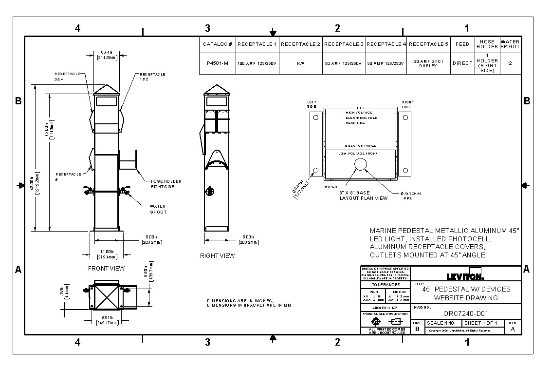 Marine Power Pedestal, Durable Metallic Aluminum, 45-Inch Height for Dockside Power. Pedestal includes (1) 100 Amp 125/250V, (2) 50 Amp 125/250V, and (1) 20 Amp GFCI Duplex Receptacles; (2) Water Valves, (1) Hose Holder, LED Light and Photocell, and Direct Feed Busbar.