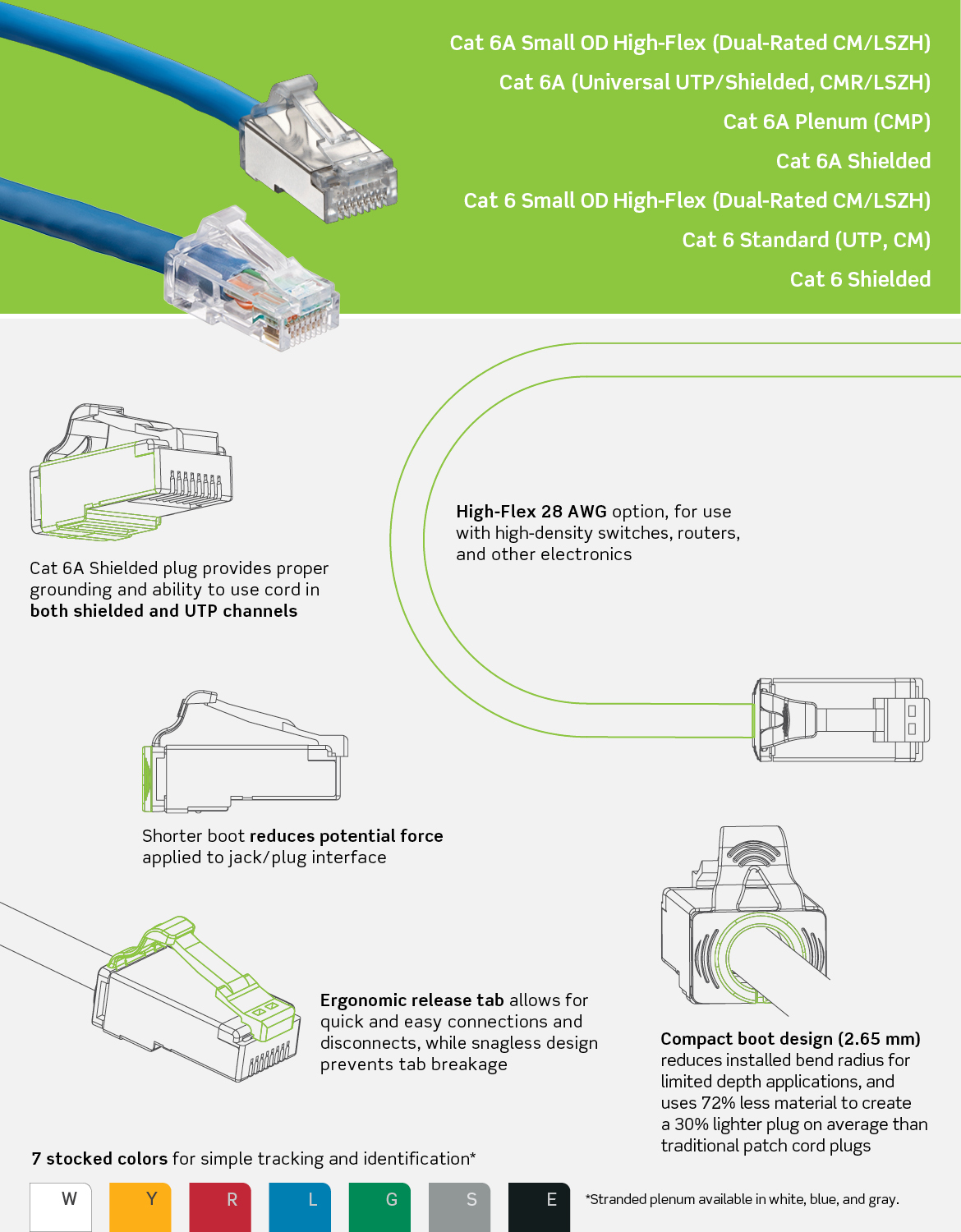 Leviton has enhanced its Cat 6A and Cat 6 patch cords with a new compact plug and boot design to provide better flexibility, durability, and bend radius, while delivering higher data rates up to 10 Gb/s. This gives network managers the support they need when addressing applications such as wireless access points, smart building devices, and PoE installations.