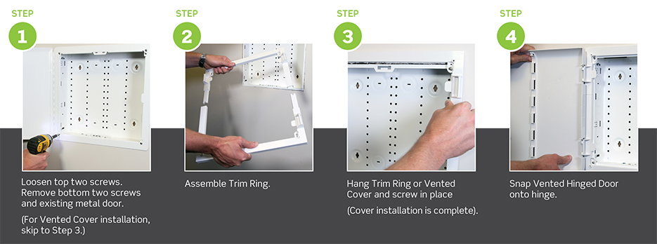 Easily transform your existing Leviton metal enclosure to support stronger wireless signals by adding a plastic Vented Cover or plastic Vented Hinged Door and Trim Ring.